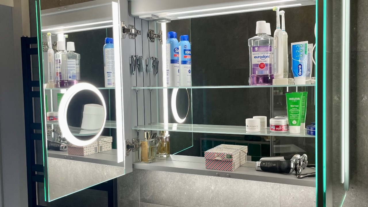 Hele fijne spiegelkast met veel ruimte voor toiletartikelen, twee handige stopcontacten en een scheerspiegel. Ook de verwarming die ervoor zorgt dat de spiegels niet beslaan tijdens het douchen is erg handig.