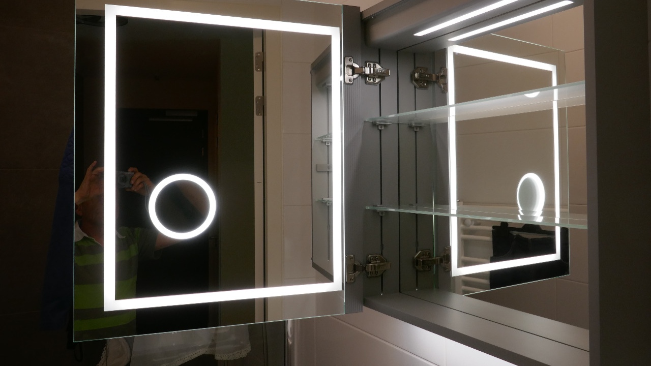 Naast de verlichting is ook de spiegelverwarming in de dubbelzijdig gespiegelde deur geïntegreerd. Deze verwarming zorgt ervoor dat de spiegeldeur niet beslaat na bv het douchen, handig! De verlichting en verwarming worden in- en uitgeschakeld middels een handbeweging langs de sensor die aan de onderzijde van de spiegelkast is gemonteerd.