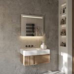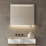 Deze 80 cm brede spiegel is aan de bovenzijde voorzien van een 2,5 cm brede lichtbalk voor praktische verlichting in het gezicht. De ambient verlichting aan de onderzijde schijnt fraai over de wand en zorgt voor veel sfeer in de badkamer. Lees verder...