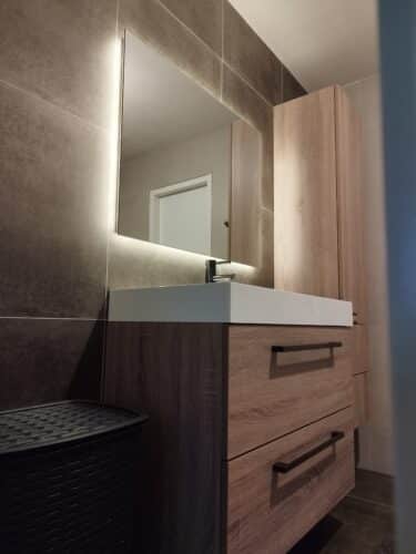 Mooie spiegel met verschillende kleur licht wat heel mooi over gaat van kleur, geen condens na douche op de spiegel