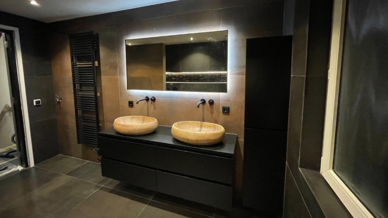 Luxe badkamer spiegel met mat zwart frame en instelbare lichtkleur, handig!