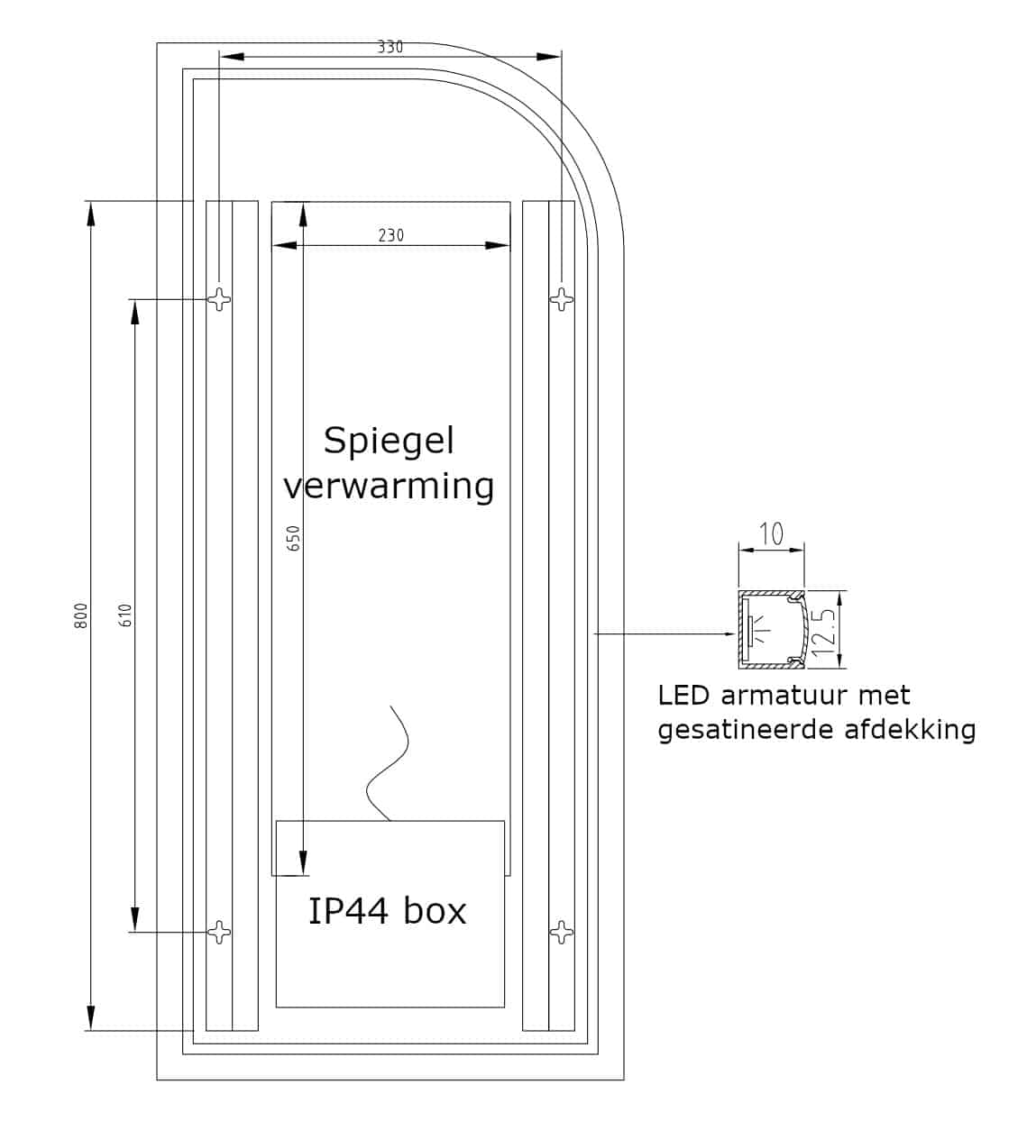 De touch schakelaar met handige dimfunctie is in het spiegelglas verwerkt. Hiermee wordt zowel de verlichting als de verwarming bediend.