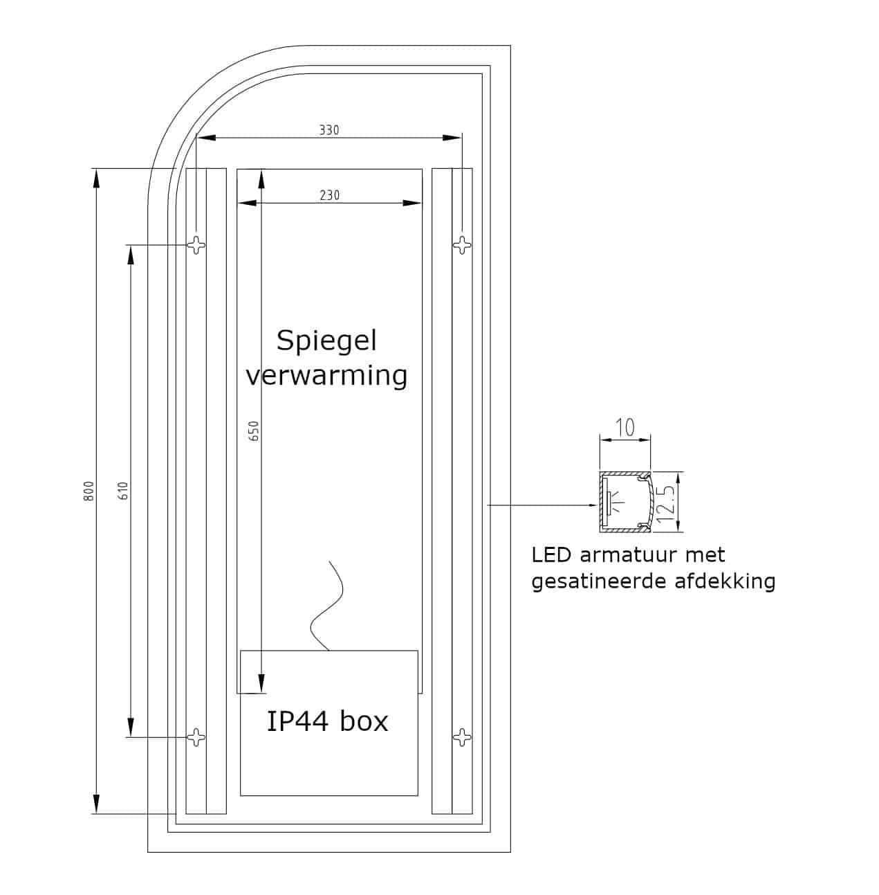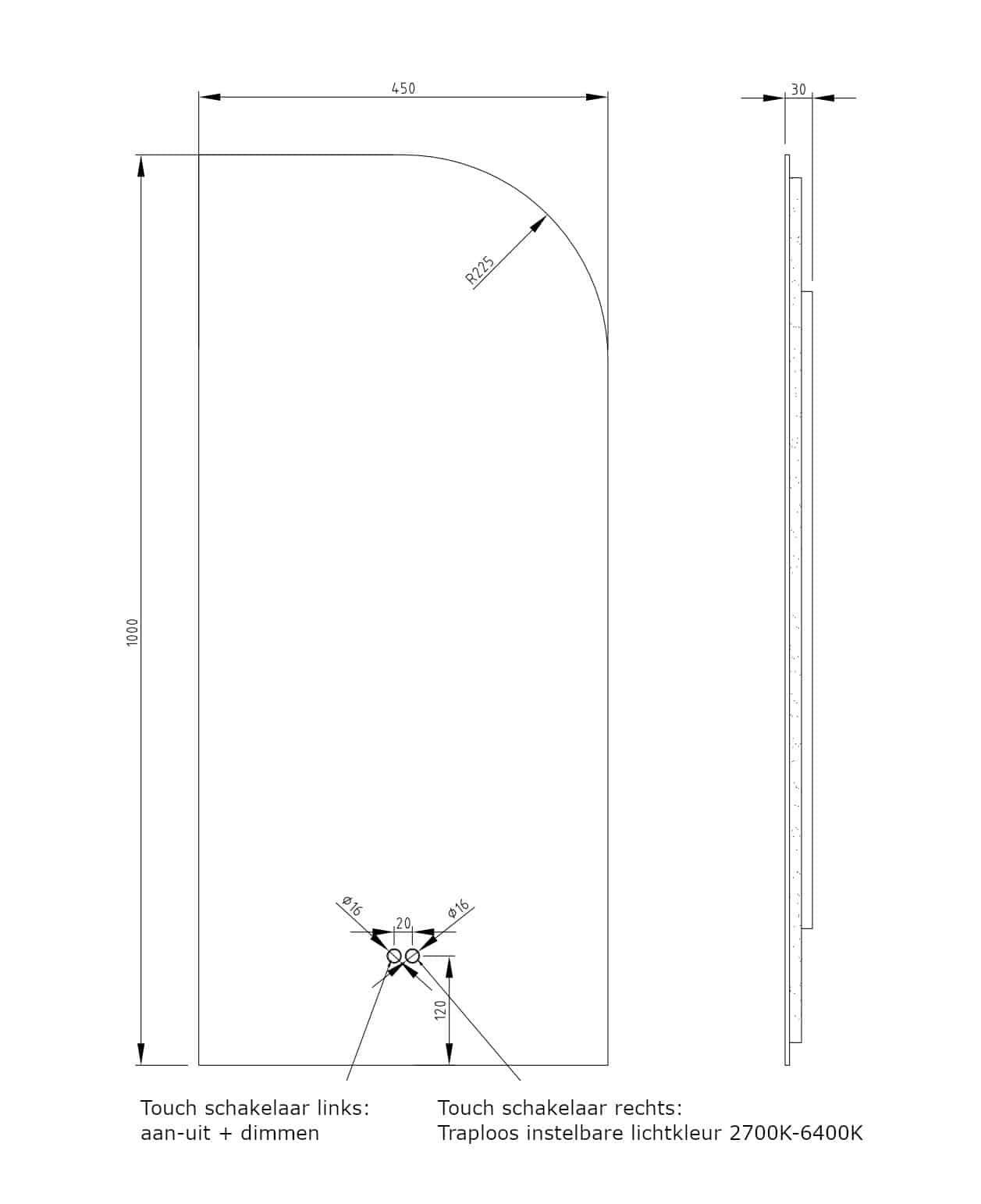 Zowel de verlichting als de verwarming worden bediend met de linker touch schakelaar aan de voorzijde van de spiegel. Door de touch knop ingedrukt te houden wordt de verlichting traploos gedimd. Zo stel je zelf de juiste lichtsterkte in.