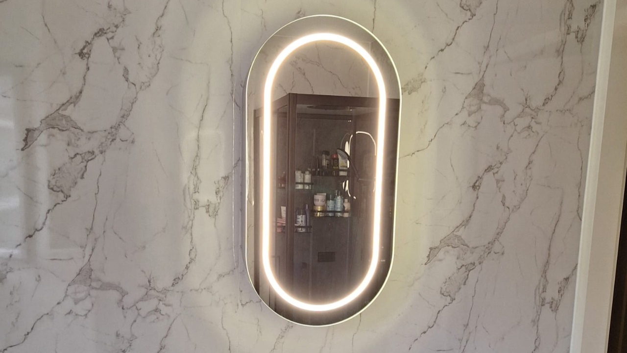 Wat een prachtige spiegel een verrijking in de badkamer. Wij hebben deze in een hoek geplaatst. Voorkant en binnenkant zijn spiegels en de verlichting werkt door je hand onder de spiegel te bewegen.