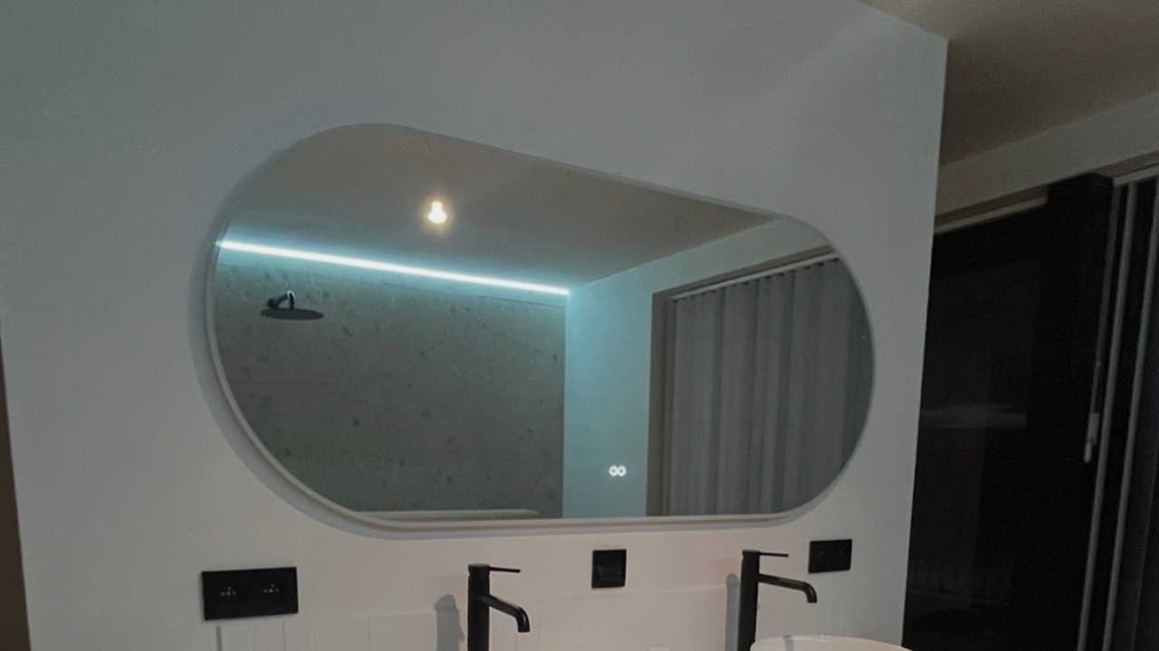 Indirecte verlichting aan de achterzijde van de spiegel. Dit type verlichting zorgt voor een sfeervol lichtschijnsel over de wand