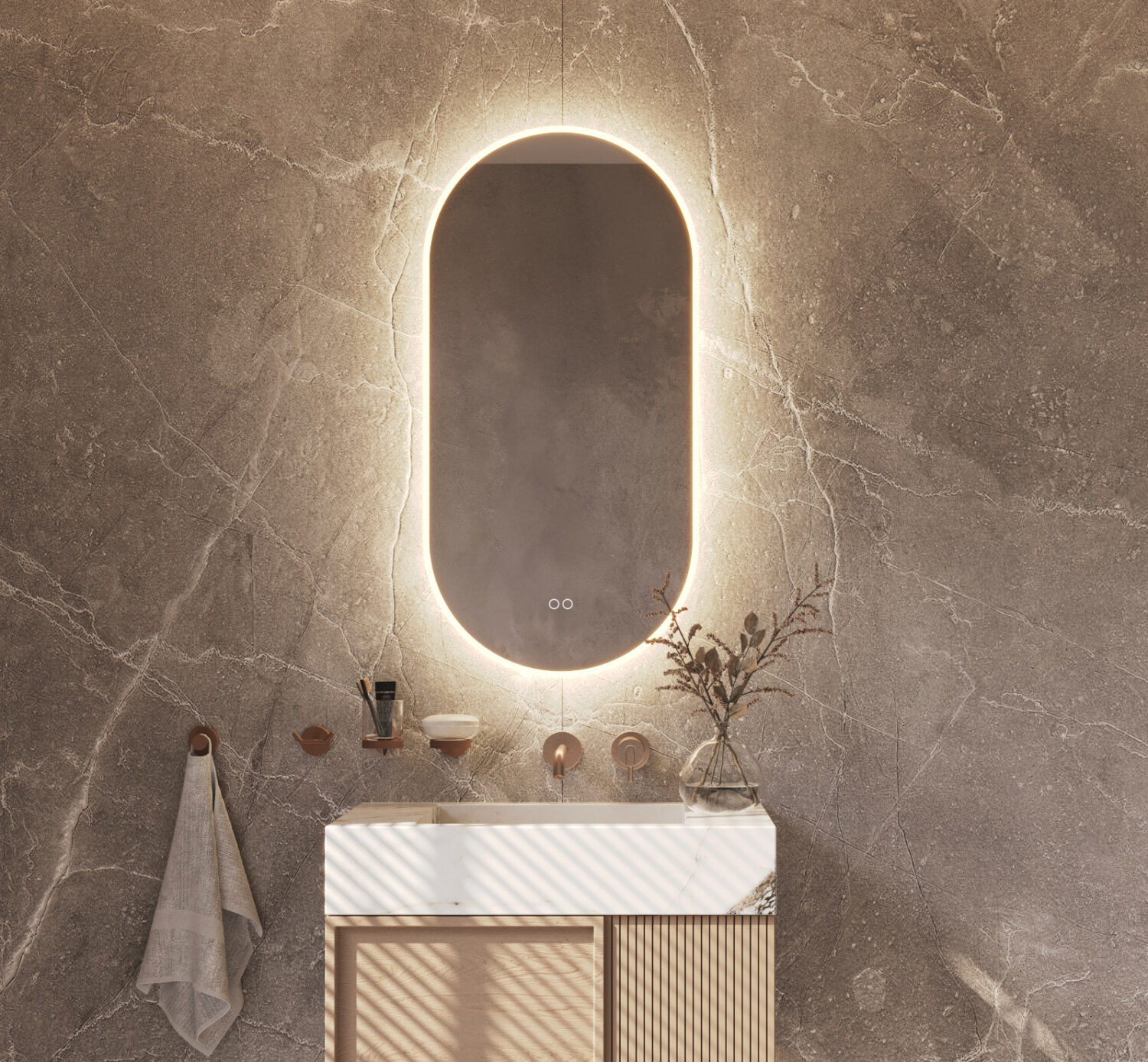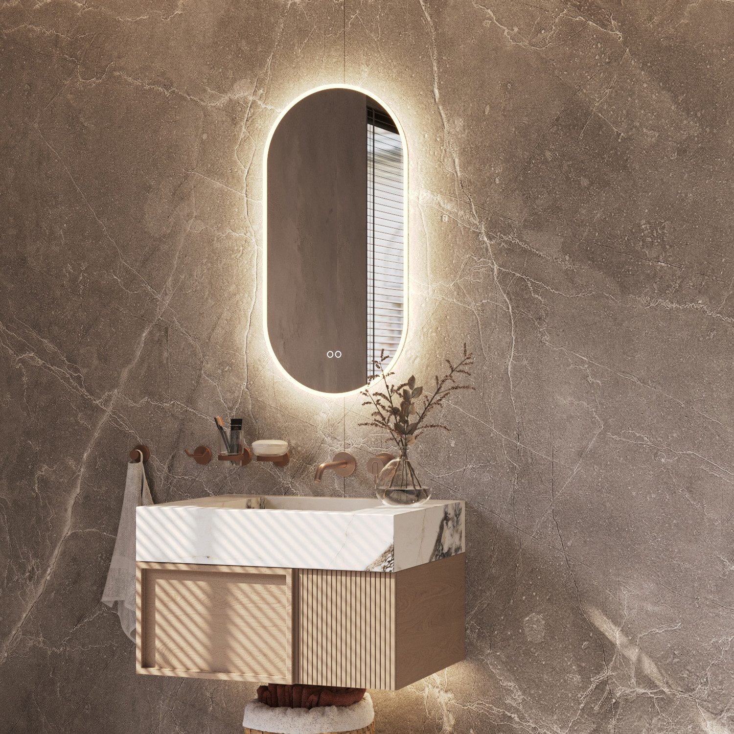 Deze ovale design spiegel van 40 cm breed en 100 cm hoog is van alle gemakken voorzien, zoals: geïntegreerde directe + indirecte verlichting, spiegelverwarming, instelbare lichtkleur en een dimfunctie