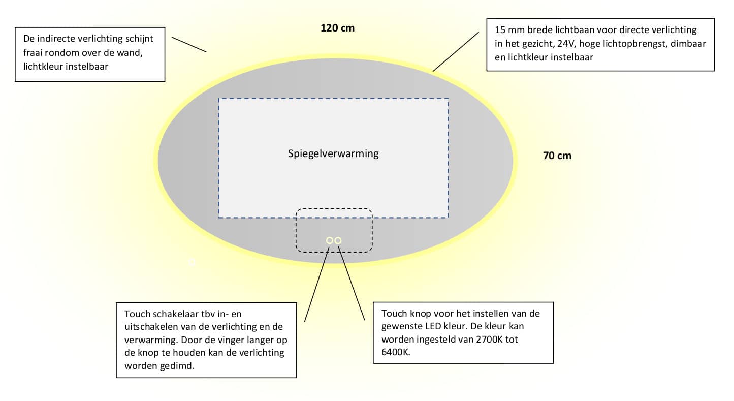 De 24V hi-power verlichting is dimbaar middels een druk op de touch schakelaar, zodat de gewenste lichtsterkte naar eigen wens kan worden ingesteld. Daarnaast kan met een tweede touch schakelaar de juiste lichtkleur naar wens worden ingesteld. Uiteraard is ook deze ovale spiegel voorzien van spiegelverwarming, handig!