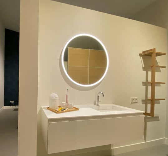 Deze 80 cm ronde badkamer spiegel is rondom voorzien van 24V hi-power LED verlichting, spiegelverwarming en een touch schakelaar met dimfunctie voor de verlichting. De praktische verlichting schijnt door de 15 mm lichtbaan in het gezicht en geeft daardoor voldoende licht bij bv het scheren of het make-uppen.