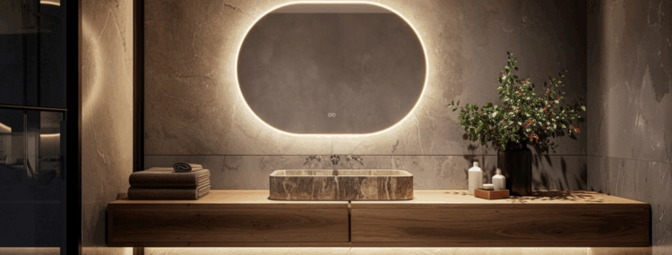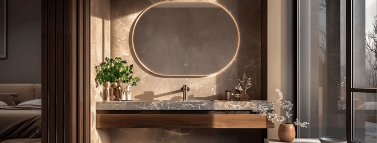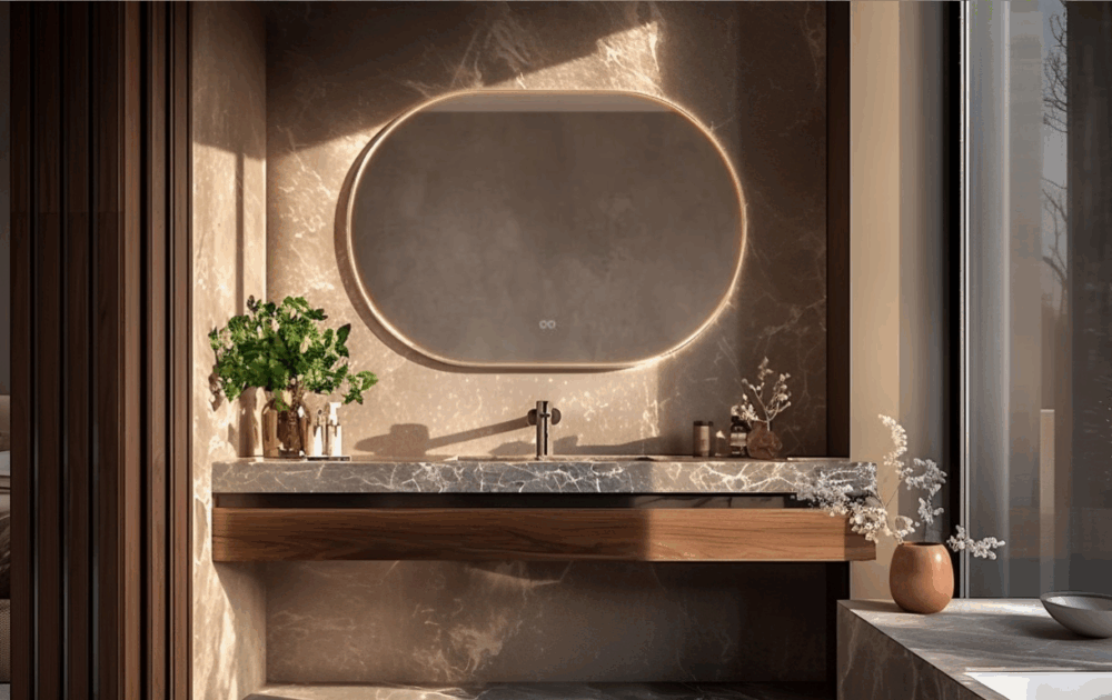 De zachte lijnen van een ovale spiegel geven de badkamer een elegante uitstraling. Ze passen prachtig bij klassieke materialen zoals natuursteen en hout.